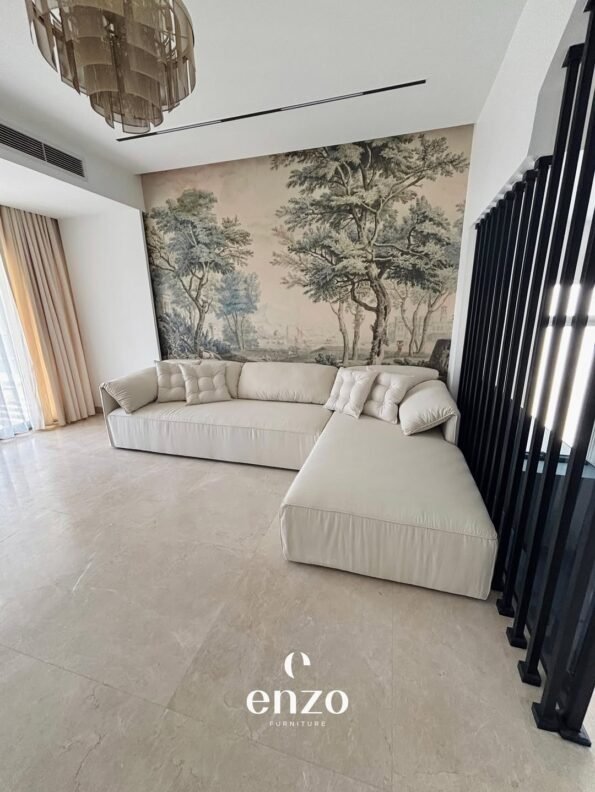 A spacious and stylish L-shape sofa from Enzo, perfect for modern living spaces. This sofa features a clean, minimalist design with plush, tufted back pillows that add a touch of sophistication. Its generous seating and cozy chaise lounge make it ideal for relaxing and entertaining guests. The versatile beige fabric allows it to blend seamlessly with any decor style, from modern to classic.