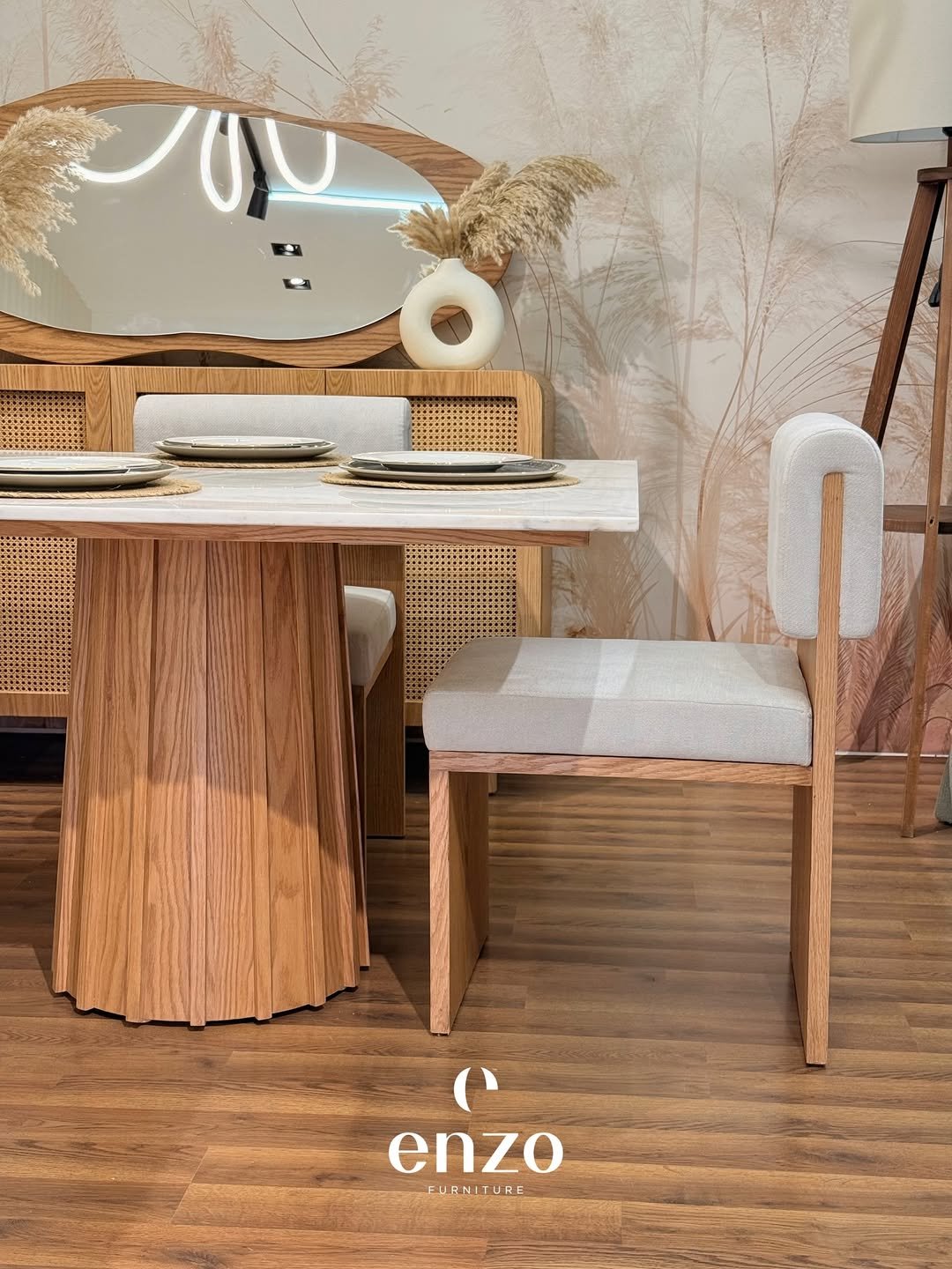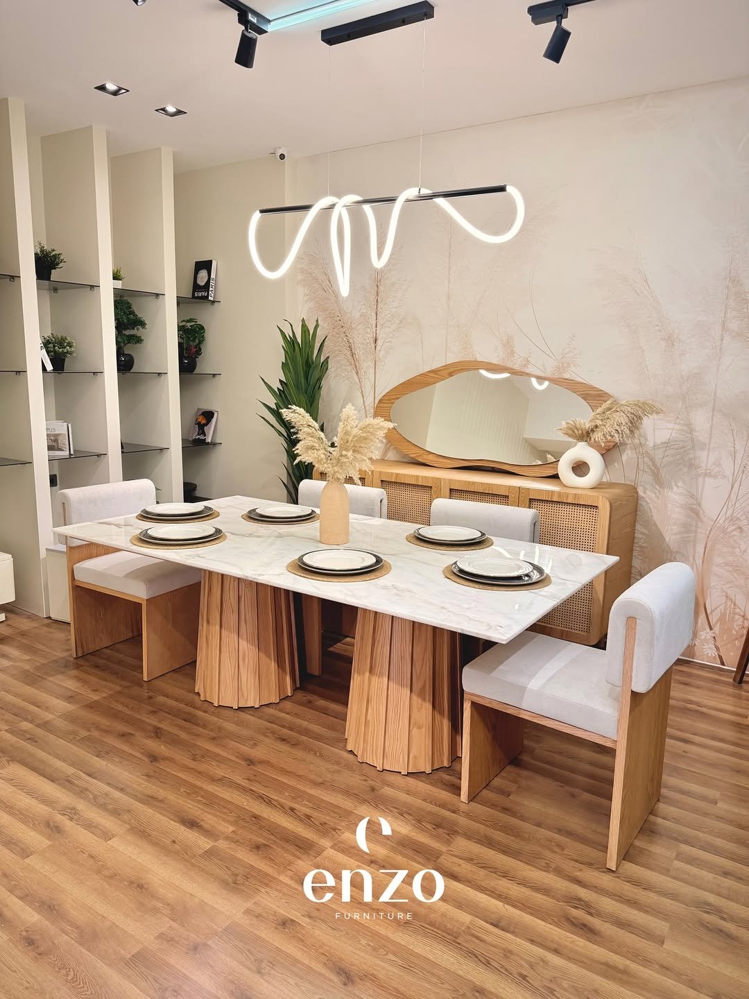 The Enzo Dining Table combines elegance and functionality, crafted with premium-quality materials to bring timeless style to your home. Designed with a sleek modern finish, it offers a perfect balance between sophistication and durability. Its spacious surface makes it ideal for family gatherings, dinner parties, or everyday meals, while the sturdy structure ensures long-lasting use. A centerpiece that elevates your dining space with a touch of contemporary luxury
