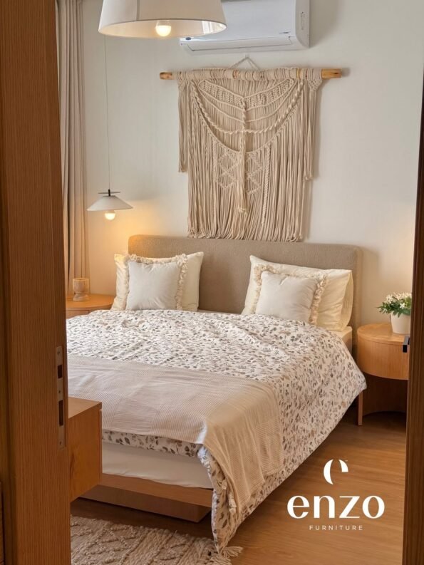 A warm and inviting bedroom set from Enzo, designed to create a peaceful and stylish retreat. The set includes a minimalist bed frame with a soft, upholstered headboard, and two unique, curved wooden nightstands that add a touch of modern flair. The natural tones and clean lines make it a perfect choice for those who appreciate understated elegance and a serene atmosphere.