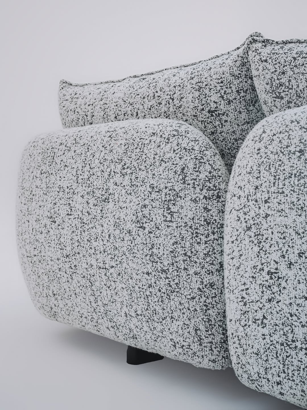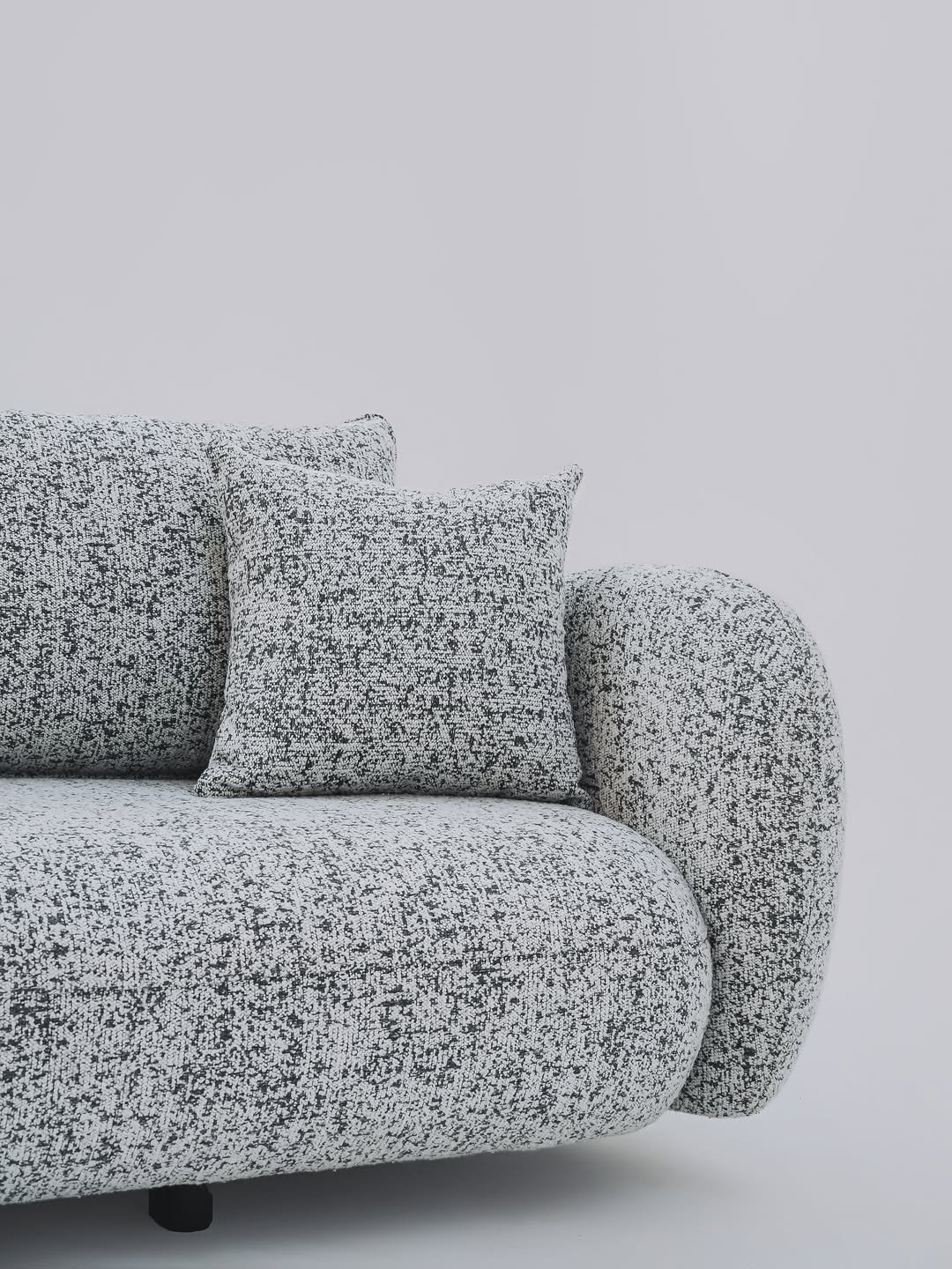 A stylish, curved sofa with a soft boucle fabric, combining comfort and modern elegance.